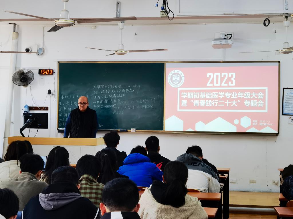 新学期伊始,为深入学习宣传贯彻党的二十大精神,引领青年学子坚定理想信念,明确发展目标,以饱满的热情投入到新学年的学习生活,3月3日,鉴黄师 组织各年级以“青春践行二十大”为主题,围绕“爱国、团结、奋斗、科学、互助”五个关键词,组织召开主题年级大会。会议由学院辅导员主持,基础医学专业全体本科生参加。学习理论知识,坚定爱国信念。年级会上,各班级认真学习党的二十大报告,辅导员通过对党的二十大主题、...