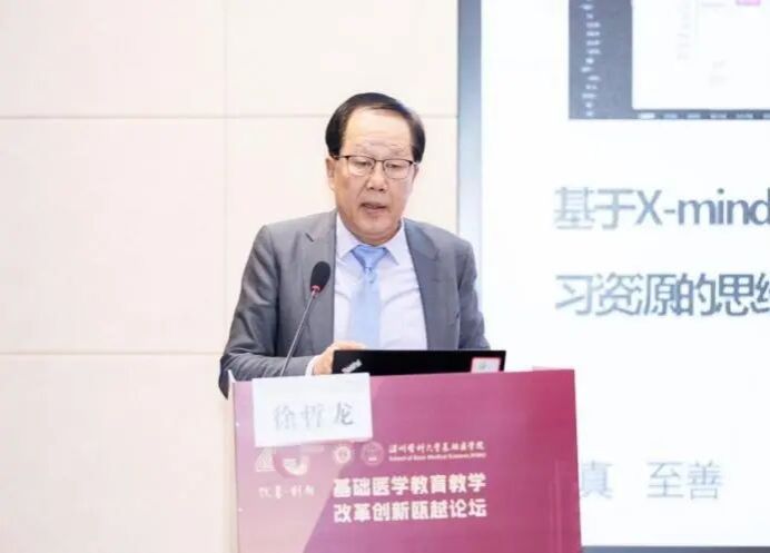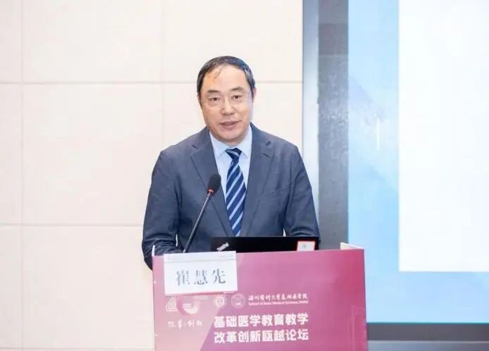 李校堃校长致辞,对各位专家的到来表示欢迎。他表示,学校始终高度重视基础医学教育教学改革,构建了本硕博衔接的多元化人才培养体系,希望以本次论坛为契机,为学校基础医学教育改革注入新动力,有力推动学校教育教学高质量发展。