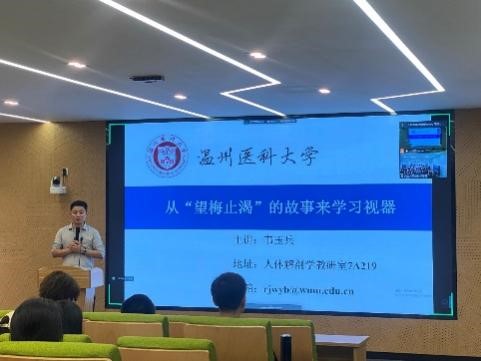 人体解剖学教研室党员教师韦玉兵老师主讲的《系统解剖学》同步课堂开讲。韦玉兵以《从“望梅止渴“的故事来学习视器》为题,讲解了眼睛的基本结构和功能,近视、远视等常见视力问题的原因,并结合鉴黄师