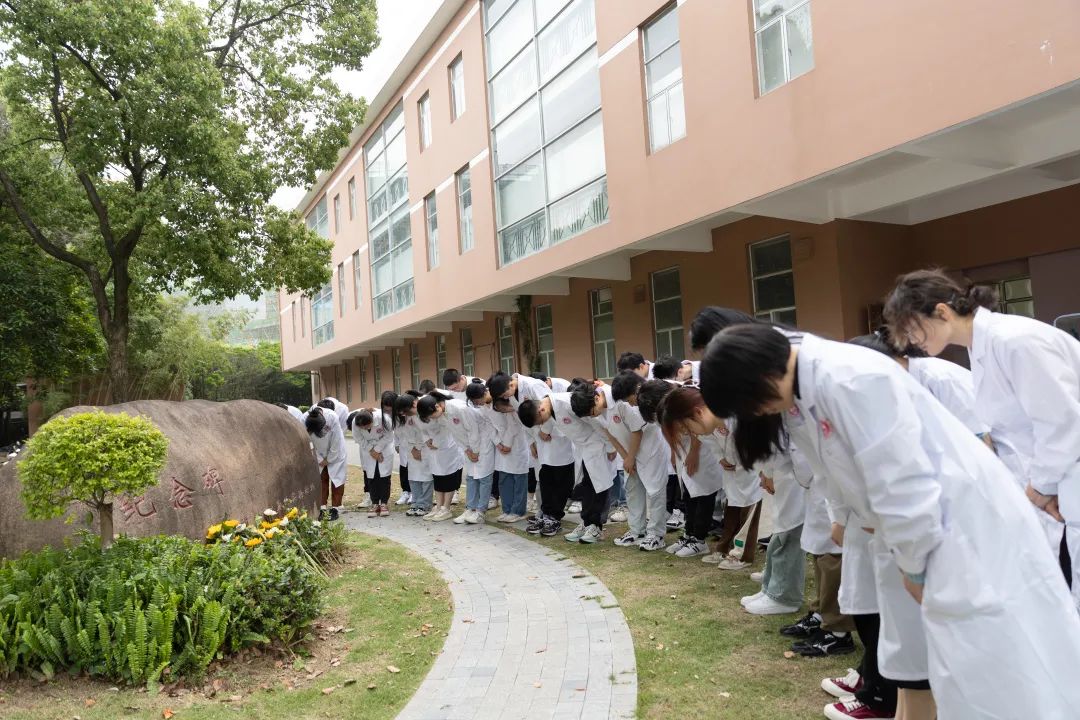 4月22日上午,在学校实验动物纪念碑前,师生们身着白大褂,手持菊花,依次整齐地站立在纪念碑前默哀鞠躬,表达对它们的尊重和敬意。