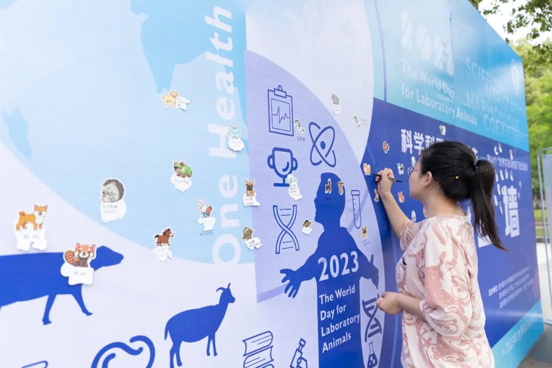 在同德楼广场,学校举办“走近实验动物”系列科普活动,向师生普及实验动物基本知识、实验动物福利及相关法规。大家还为各种实验动物取名并写在签名墙上,铭记为医学献身的实验动物。