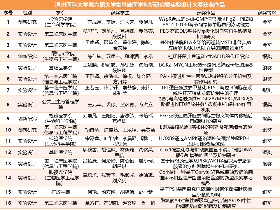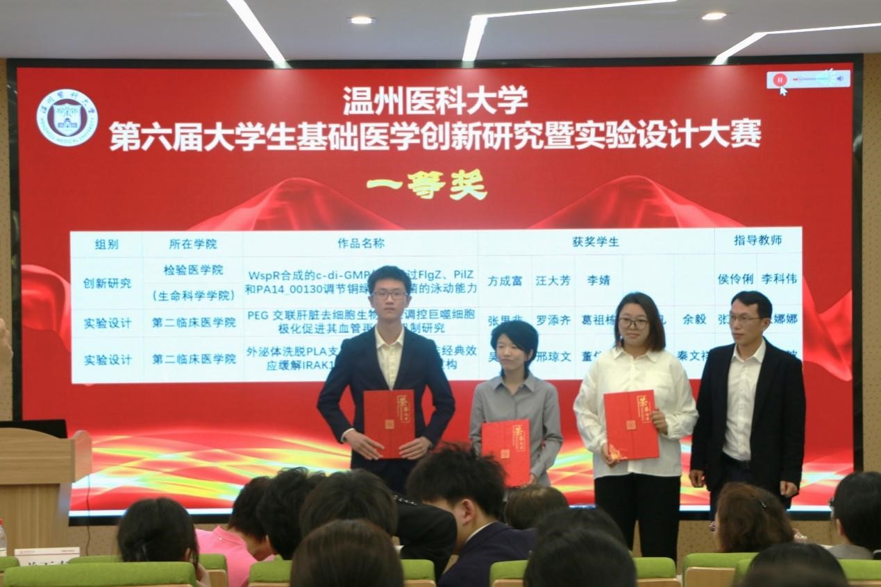 、检验医学院(生命科学学院)、药学院、公共卫生与管理学院、第一临床医学院(信息与工程学院)、第二临床医学院、眼视光学院(生物医学工程学院)和仁济学院等8个学院200余位学生组成的34支队伍分组汇报答辩,经评委的双盲评审,最终评选出16个获奖作品。