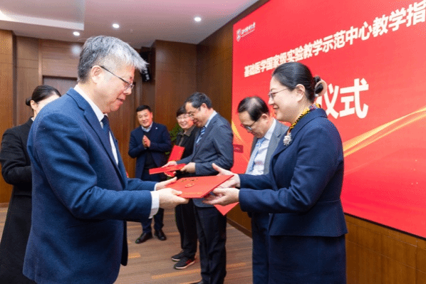 新一届教指委聘任仪式上,教务处副处长卢丽笋宣读聘任文件,李校堃校长为委员颁发聘书。