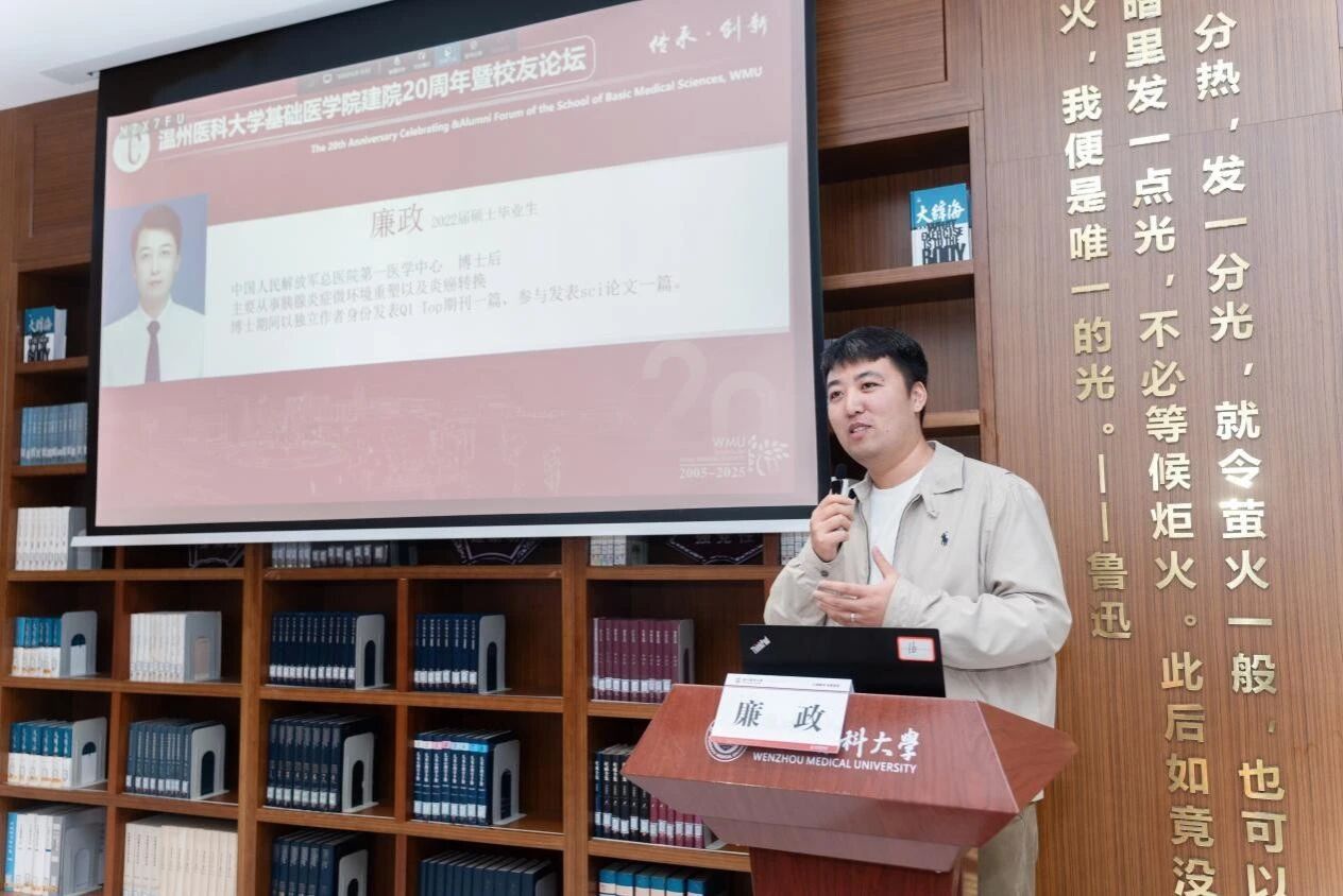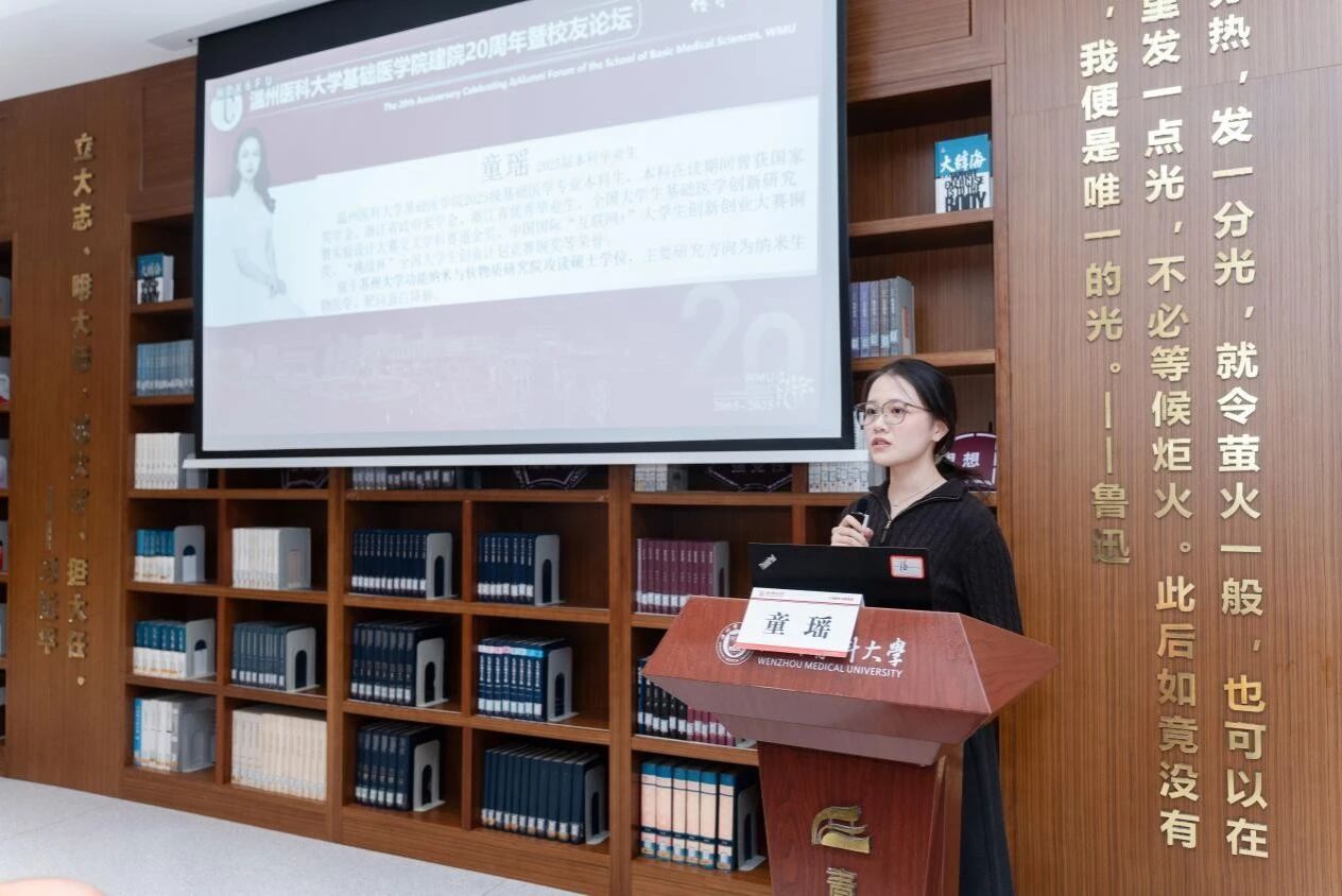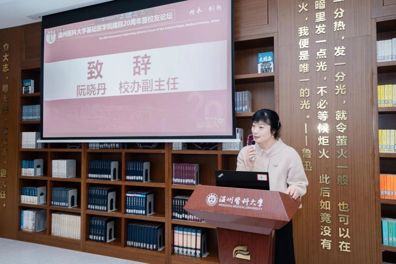 二十载的发展足迹离不开校友的牵挂,称赞校友们带着“仁肃勤朴,求是奋发”的温医精神,在医疗、科研、产业、教育等领域成为中坚力量,是学弟学妹的“鲜活榜样”与母校的骄傲。她强调,“校友母校共同体”是联结彼此的纽带,并回顾了校友们在就业支持、科研捐赠、学术交流等方面的暖心行动。她表示,本次论坛既是“忆往昔、叙情谊”的相聚,也是“传经验、谋未来”的接力,寄语校友们在学校冲刺“双一流”建设的关键阶段,发挥资源优势助力招才引智、学科发展与就业拓展,多为母校的新成就、新发展喝彩加油。致辞情真意切,赢得阵阵掌声。