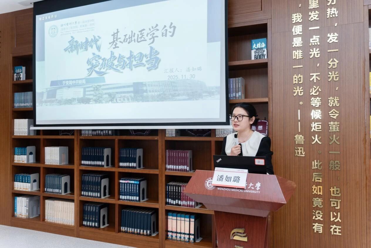 校友分享环节,四位校友代表结合自身经历,分享了各自在医学道路上的探索与感悟。孟锐锋校友从个人职业选择与创业历程的视角展开,分享了如何保持积极乐观心态的技巧和准则,鼓励青年学子打开就业择业视野。廉政校友回顾了在母校的求学时光,围绕自身博士后工作历程,讲述了扎根基础研究的奋斗故事,诠释了“基础人”不畏难、勇担当的职业追求。潘如璐校友围绕“新时代基础医学的突破与担当”,通过个人成长经历及科研成果分享,指出基础研究就是要多参与、多试错、多与“失败”做朋友,同时鼓励大家积极参与成果转化,把握新时代赋予的科研机遇。童瑶校友则以“青年基础人的成长指南”为主题,从学业规划、职业选择、心态培养等方面,为学弟学妹们分享了实用经验,传递出新时代基础学子的责任与担当。近一个小时的分享干货满满,既有校友对过往的深情回望,也有对当下的深刻思考,更饱含对未来的殷切期许,引发了在场师生的强烈共鸣。