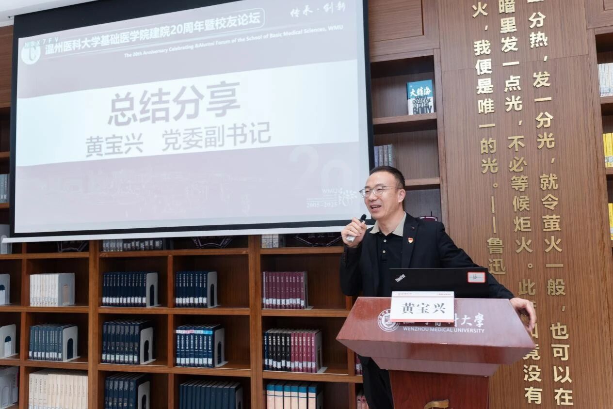 学院党委副书记黄宝兴作总结分享。他代表学院向长期以来关心支持学院发展的校友们表示衷心感谢。他简要回顾了学院二十年来的发展成就,强调学院的进步离不开每一位“基础人”的拼搏与奉献。他表示,学院将以二十周年院庆为新的起点,秉持“明德铸基 博新立础”院训,继续坚守育人初心,深耕基础医学领域,不断提升办学水平与人才培养质量。同时,他希望广大校友能够常回家看看,持续关注和支持学院发展,与母校一道,为培养更多优秀医学人才、推动医学事业进步而不懈奋斗。
