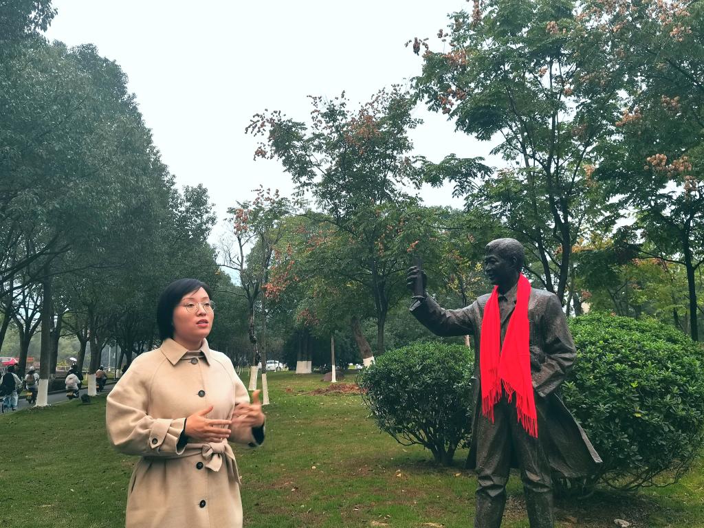 “漫步在校园绿荫下,我正和名人打招呼,走到周健博士的雕像前,仰起头望。