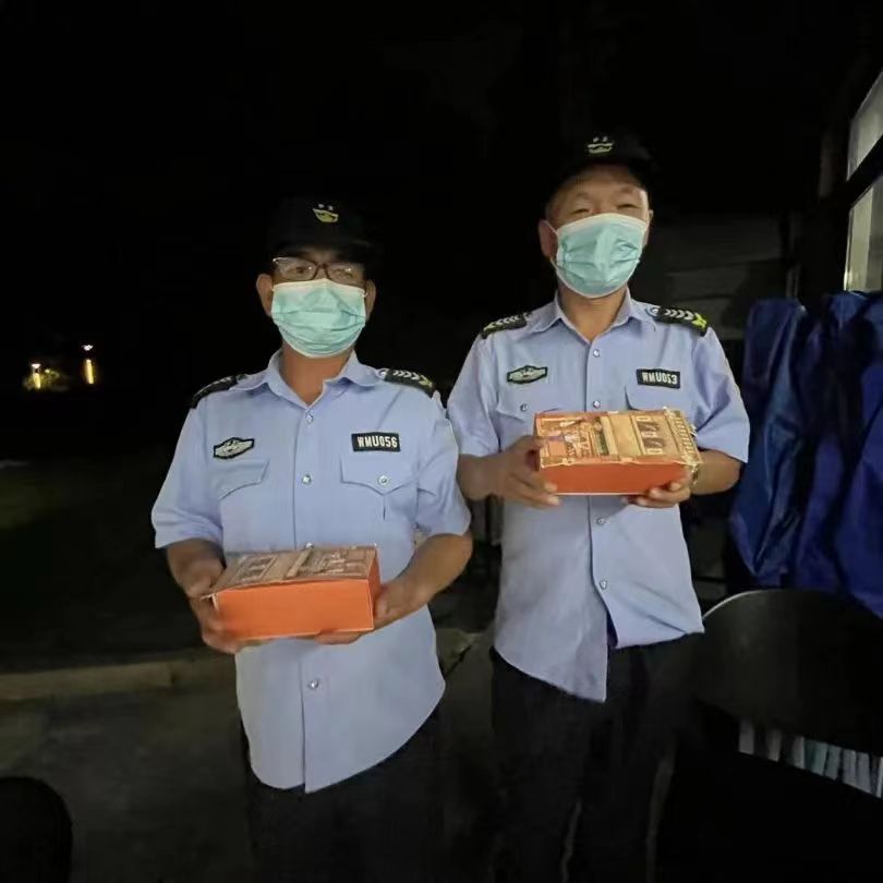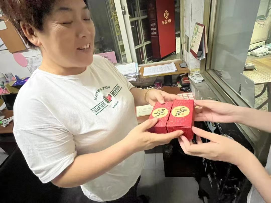 最后,同学们将亲手制作的月饼也带给了保卫叔叔和宿管阿姨,邀请他们一起欢度中秋佳节。