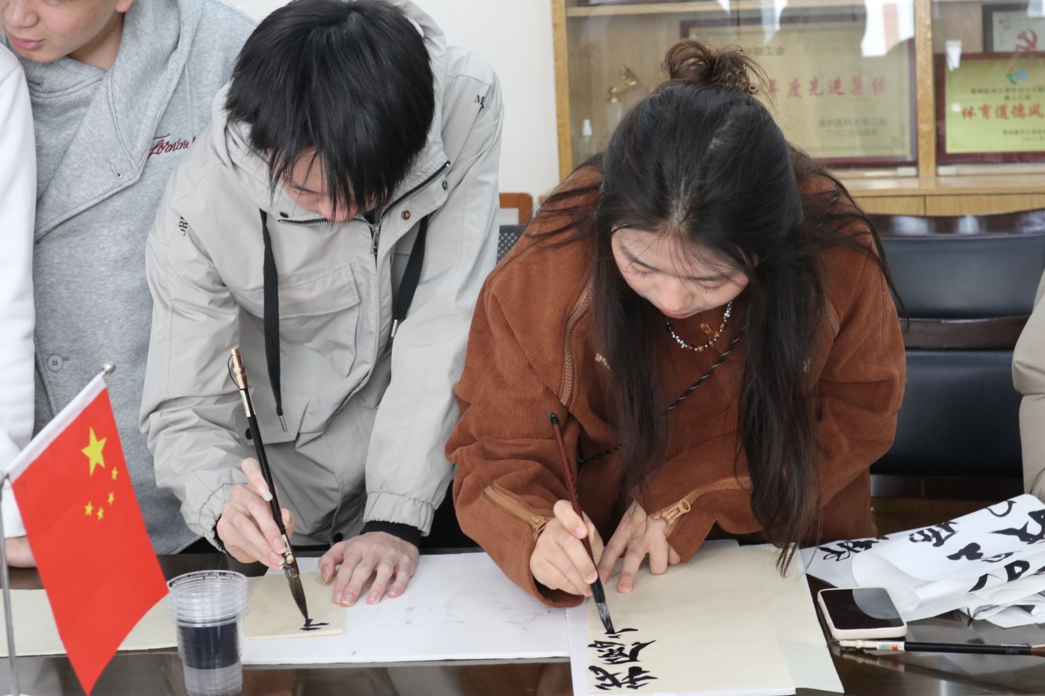 各位师生携手开展的“雷锋精神”传承活动,基础师生通过书画交流传扬雷锋精神。