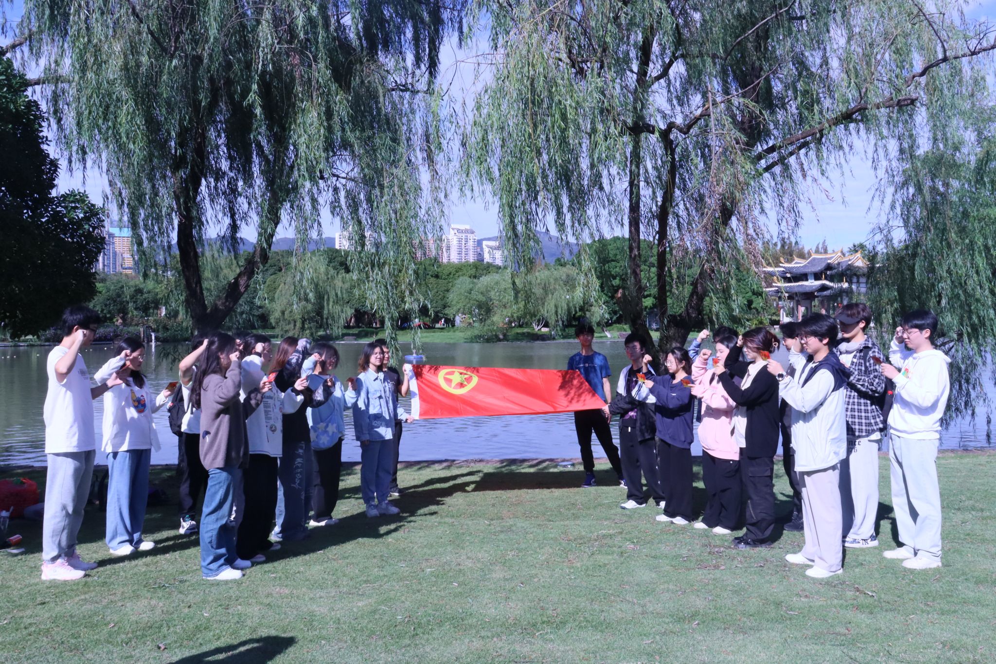 随后在共青湖畔,参与者面向团旗,在团支书的带领下重温入团誓词,并在怀青亭下分享所了解到的黄励、陈延年和陈铁军等为代表的革命青年故事,在团旗的陪伴下,参与者们回望着革命先辈们追求真理、燃烧理想的澎湃岁月,将目光投射于伟大岁月,又投身于当下,探讨新时代中国青年的时代责任。