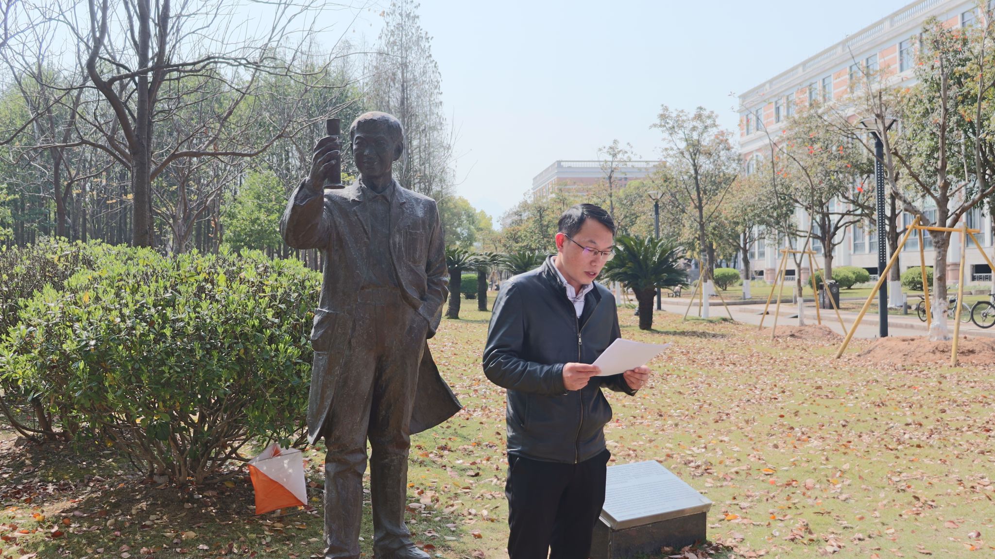 师生在茶山校区周健博士铜像前举行纪念活动。学院院长薛向阳,党委副书记黄宝兴,学工办辅导员,以及基础医学(周健创新班)全体学生怀着敬意与缅怀之情,齐聚周健博士铜像前,举行庄重的纪念仪式。