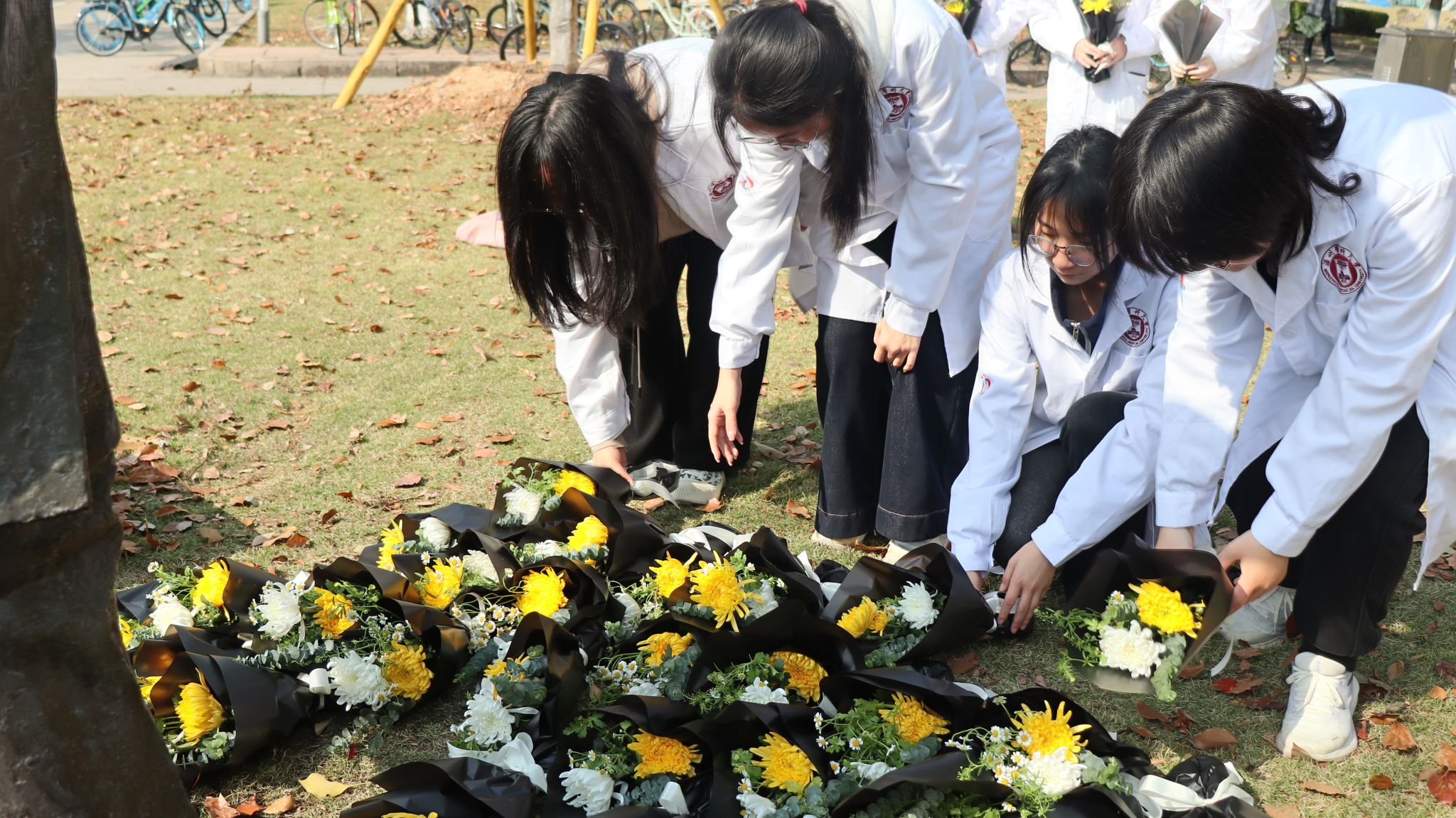 全体同学手捧鲜花,怀着崇敬与缅怀之情,依次走到铜像前,献上鲜花并深深鞠躬。同学们献上的束束鲜花,寄托着对周健博士的无限追思与敬仰。同学们走进校史馆,在讲解员的带领下再次重温周健博士的医学奋斗历程,也激励着大家在未来的学习道路上,以周健博士为榜样,努力奋进,为医学事业的发展贡献自己的力量。