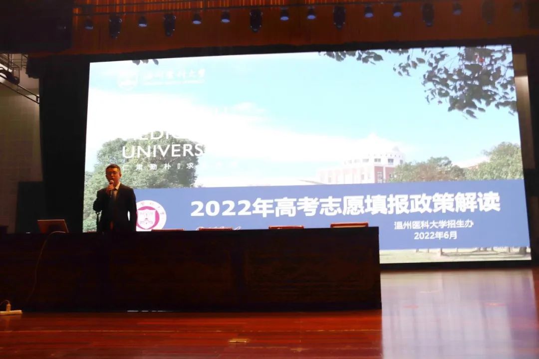 随后,金献测给在校高三学生作了“2022年高考志愿填报政策解读”的报告。他详细阐明了高考填报志愿的基本要点以及注意事项,让同学们更清晰地了解自己的定位,为报考学校、专业有效避开“陷阱”;并全面细致地介绍了温医大的办学历史、专业、学科成就等内容,让老师和同学们进一步了解温医大的教学实力、师资资源以及良好的发展前景。