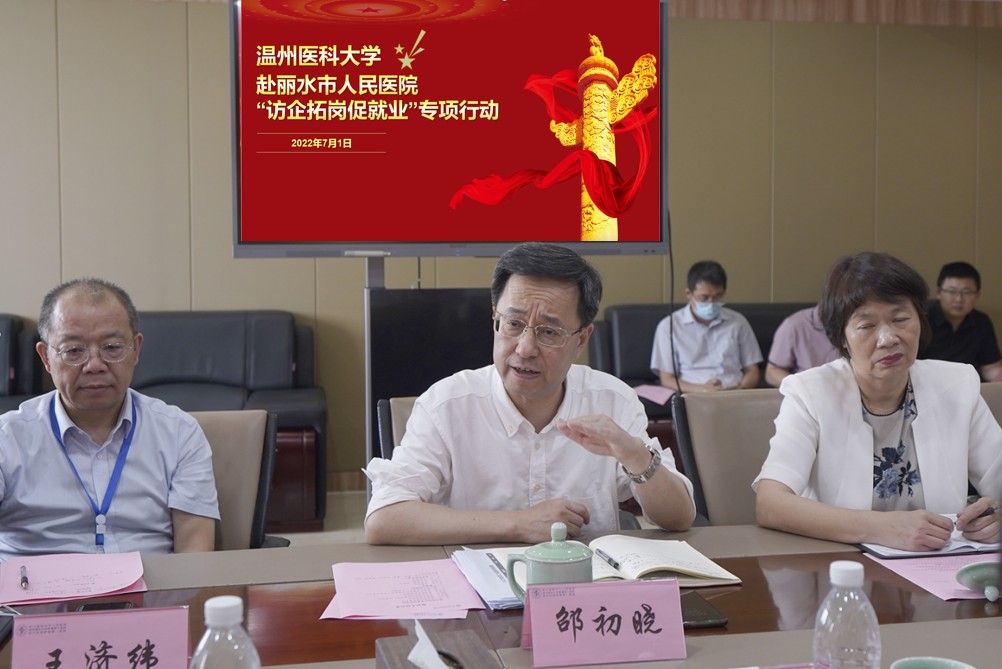 党委书记李琦、副书记黄宝兴、副院长金献测、副院长蒋朋飞,及学科与研究生工作办公室、辅导员等相关人员赴丽水市人民医院开展“访企拓岗”专项行动调研。丽水市人民医院党委书记邵初晓,党委委员方国美、刘斌,院长助理王济维,及党政综合办公室、组织人事处、医务处、科研处、教育培训处等相关科室负责人参加此次调研会。