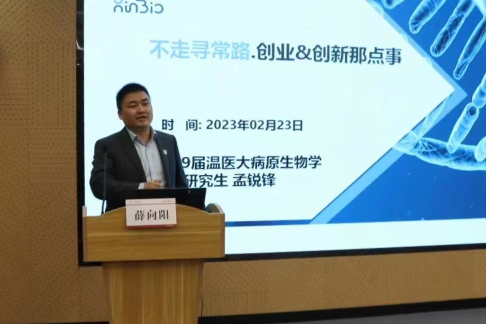 孟瑞锋校友以《不走寻常路.创业&创新那点事》为主题,讲述了自己从就读研究生期间创立温州长风生物技术有限公司到创立苏州欣协生物技术有限公司的精彩经历。从提供本地化专业化服务到自主研发独立开发,打破设备、试剂、耗材依赖进口的不利局面,真正实现国产替代的心路历程。他提到,基础医学在医疗行业的创业门槛较高,但其发展方向是产业化和产业转移。最后,孟瑞锋校友以“路虽远,行则将至;事虽难,做则必成”为结语,表达了对基础医学学子在未来创新创业上的期待。