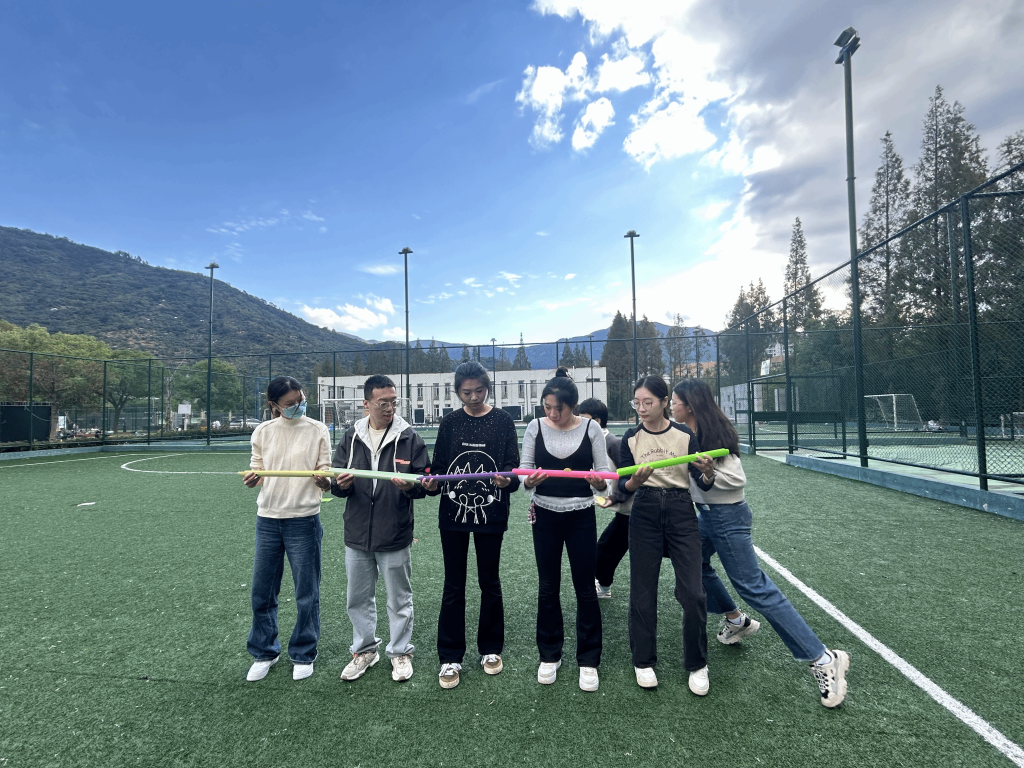 “雷区取水”:队员需互相配合,每人都要进行一次取水,将雷区的水全部取回安全区,触碰雷区视为犯规,需将本次取到的水放至原位并重新取水。这是一场考验团队沟通协调和解决问题的能力,同时也增进了彼此间的信任感。