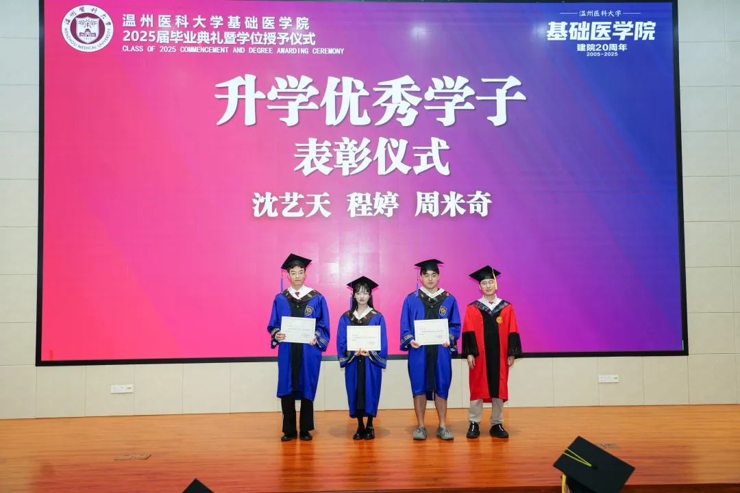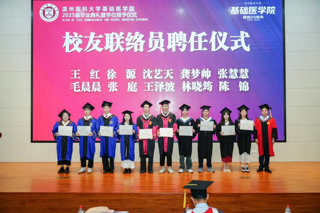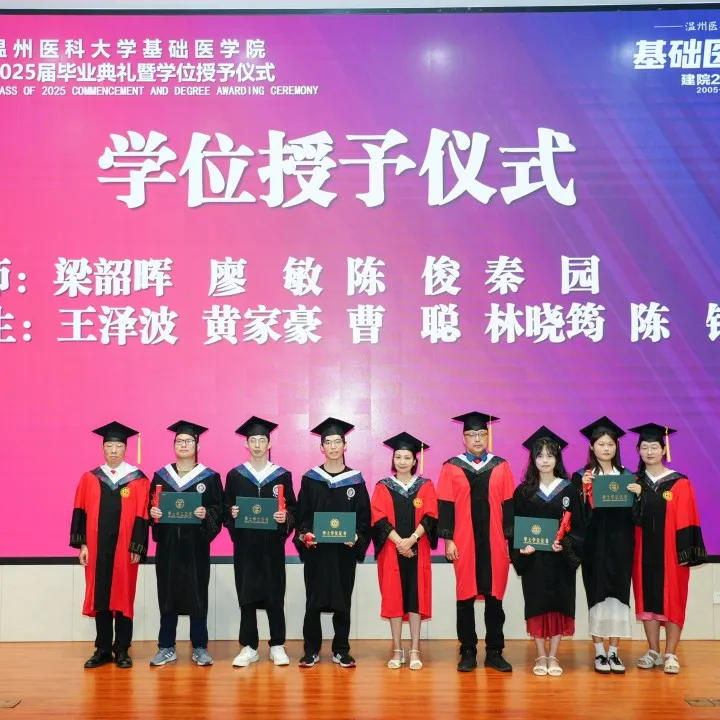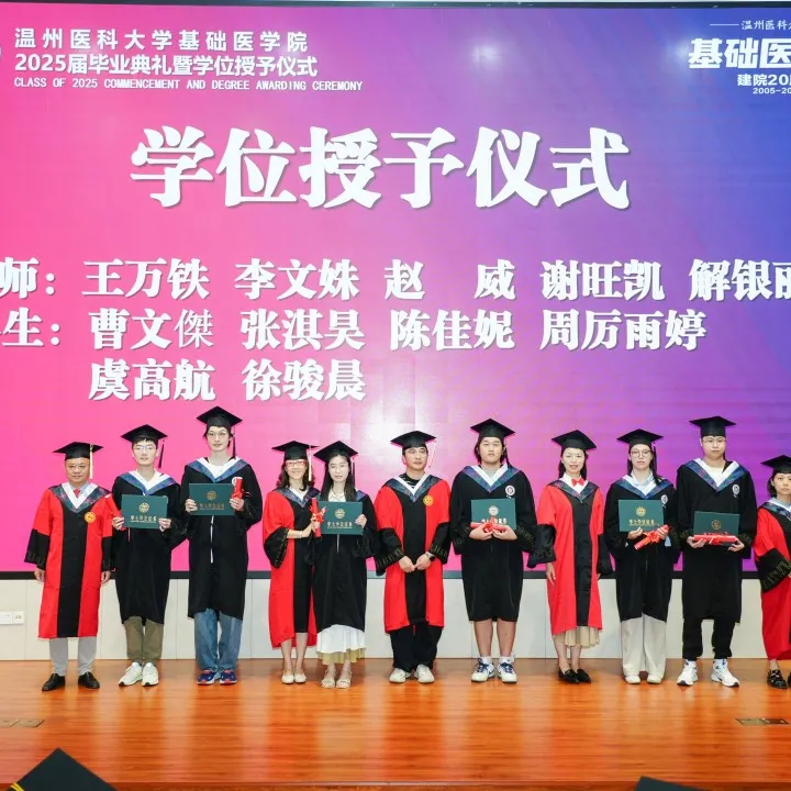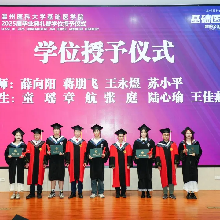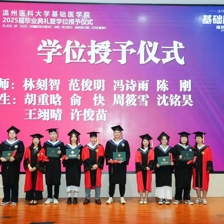 首次同时为本、硕、博三个学历层次的毕业生举行集体仪式。仪式的背后,不仅是对不同阶段求学成果的集中见证,更折射出一代代基础人“如切如磋,如琢如磨”的坚守与“踔厉奋发、坚韧不拔”的奋进内核。从本科阶段的知识积淀,到硕士、博士阶段的科研探索,三个学历层次的毕业生在此汇聚,既象征着基础医学人才培养体系的完善与发展,也彰显了学院始终秉持“仁肃勤朴,求是奋发”的校训精神,在医学教育与科研道路上不断攀登的决心。2025届毕业生们即将带着这份精神传承踏上新征程,愿他们始终坚守基础情怀,在人生更高处续写属于温医人的精彩篇章。