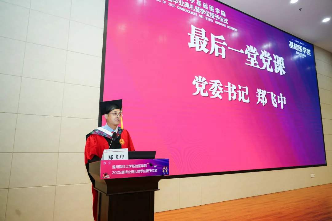 典礼上,郑飞中书记给全体毕业生上了最后一堂党课。在本次党课中,郑飞中书记对毕业生们谆谆教诲,殷殷期望:他强调传承温医精神的重要性,勉励毕业生传扬“仁肃勤朴,求是奋发”的校训,勇攀医学高峰。他希望全体毕业生都能坚守基础气质,始终“如切如磋,如琢如磨”地踏实工作,保持"板凳甘坐十年冷"的定力。他希望全体毕业生都能满怀赤子热情,扎根中国大地,争答青春问卷。同时,他也向全体毕业生送上祝福,鼓励毕业生要在未来生活中始终保有“基础人”的精神特质,踔厉奋发、坚韧不拔。