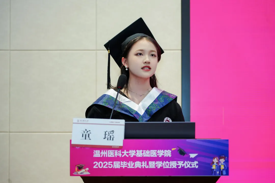 浙江省优秀毕业生代表童瑶,分享了她过往五年的学习经历。作为基础医学(周建创新班)的第一届毕业学子,她在学习中深耕探索,并于此中追寻到基础研究所要求的恒心与责任。她感恩着提供支持与帮助的学校、老师、家人和同学,她呼吁同学们以探索者、守护者与贡献者的身份向着未来扬帆起航。