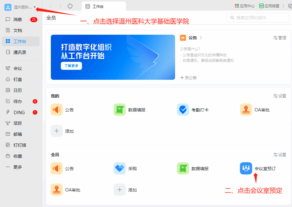 ,搜索会议室,点击会议室预定(可以直接钉钉扫以下的二维码跳过此步骤);