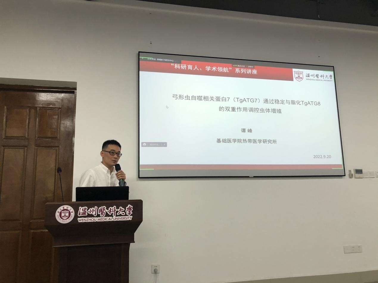 活动第二个主题,“弓形虫自噬相关蛋白7(TgATG7)通过稳定与脂化TgATG8的双重作用调控虫体增殖”,谭峰教授介绍了顶质体在弓形虫的生长发育作用,探讨了TgATG7与TgATG8互作调控弓形虫的增殖,维持体内自噬水平的稳态机制。