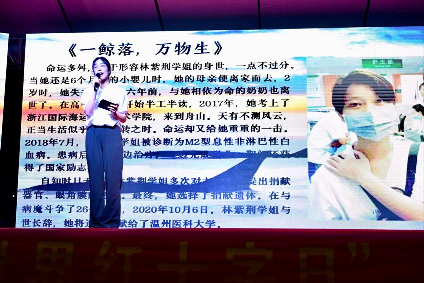 5月7日晚,由瑞安市红十字会主办的“生命教育 救在身边”———纪念第76个“世界红十字日”文艺演出在瑞安市明镜公园举行,承启荣光志愿服务队带去了《感恩的心》手语操和《一鲸落,万物生》故事分享两个节目。“感恩的心,感谢有你……”宛转悠扬的歌声中,身着鲜红志愿者服的承启荣光志愿服务队队员们有力地挥动双手,用手语和歌声传达着句句歌词的深意。同时也表达了温医大学子们心怀感恩的医者仁心情怀。“人不应该是插在花瓶里供人观赏的静物,而是蔓延在草原上随风起舞的韵律。”傅恒喆同学以《一鲸落,万物生》为题,将遗体捐献者林紫荆学姐的故事娓娓道来。坚强的林紫荆学姐勇敢面对生活中的种种困难,并在病魔折磨之下,毅然决定将遗体捐献给鉴黄师