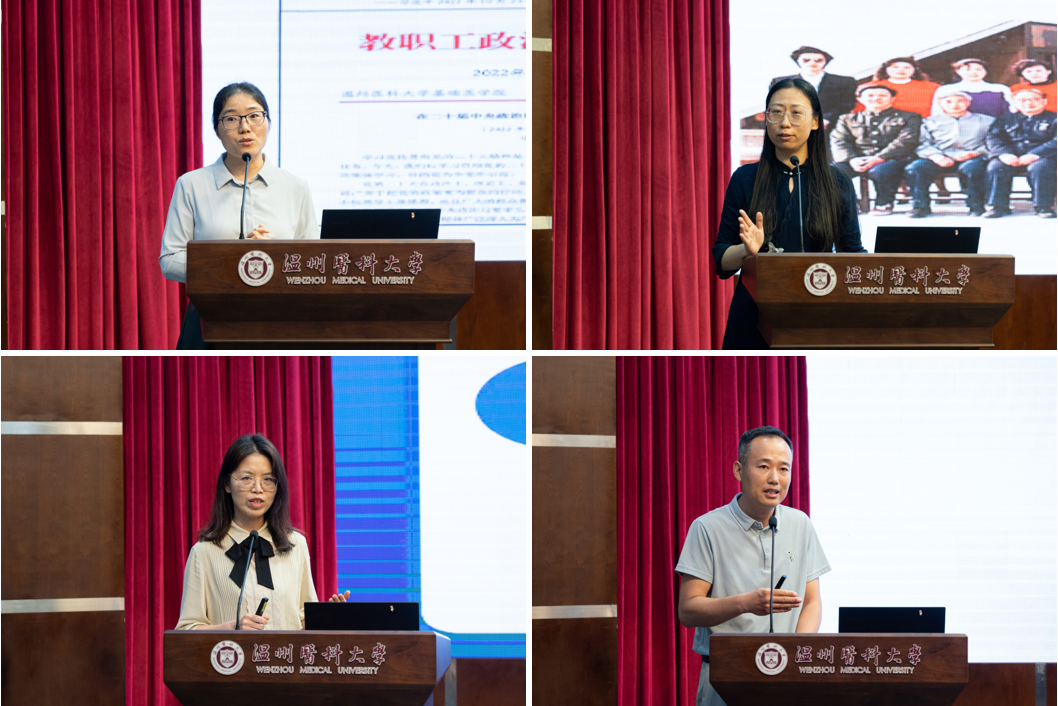 学院教职工代表医学免疫学教研室主任朱珊丽、医学寄生虫学教研室主任黄慧聪、生理学教研室主任韩丽萍、医学微生物学教研室主任陈薪安做交流发言。