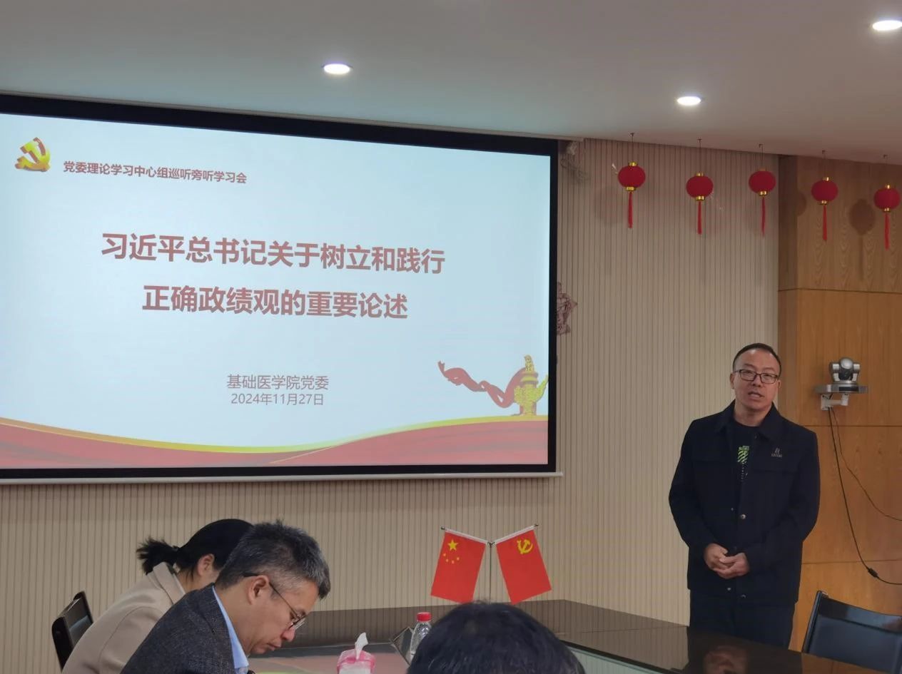 会上,学院党委副书记、纪委书记黄宝兴围绕学习主题,从认识树立和践行正确政绩观的正确意义、全面把握树立和践行政绩观的丰富内涵等方面讲解习近平总书记关于“政绩为谁而树、树什么样的政绩、靠什么树政绩”的重要论述和讲话精神。学院院长薛向阳、副院长金献测、副院长蒋朋飞就如何树立和践行正确的政绩观进行了深入剖析和讨论,同时结合岗位职责和工作实际,围绕高层次人才引育、教育教学改革推进、基础医学专业建设、人体科学馆建设,以及强化科研质量与创新、推动学院高质量发展等方面进行交流发言。