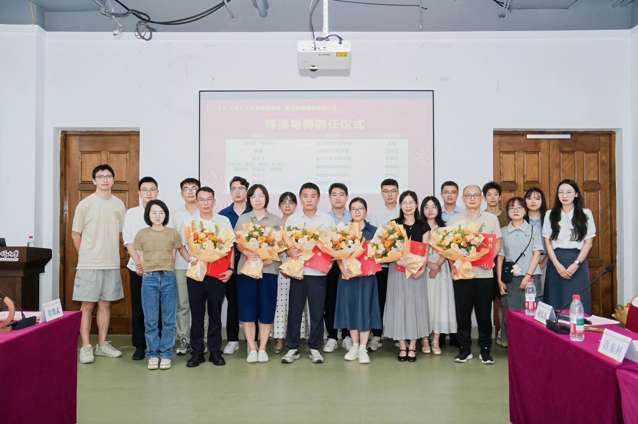 文心雕琢,甘为人梯。为关爱新教工成长,学院为他们配备了师德导师。郑飞中书记为受聘的师德导师颁发证书,新教工代表向导师献花,表达对导师的尊敬。聘任师德导师将充分发挥优秀教师的示范引领作用,帮助新教工快速适应岗位,提升师德素养与教学能力,助力青年教师成长。