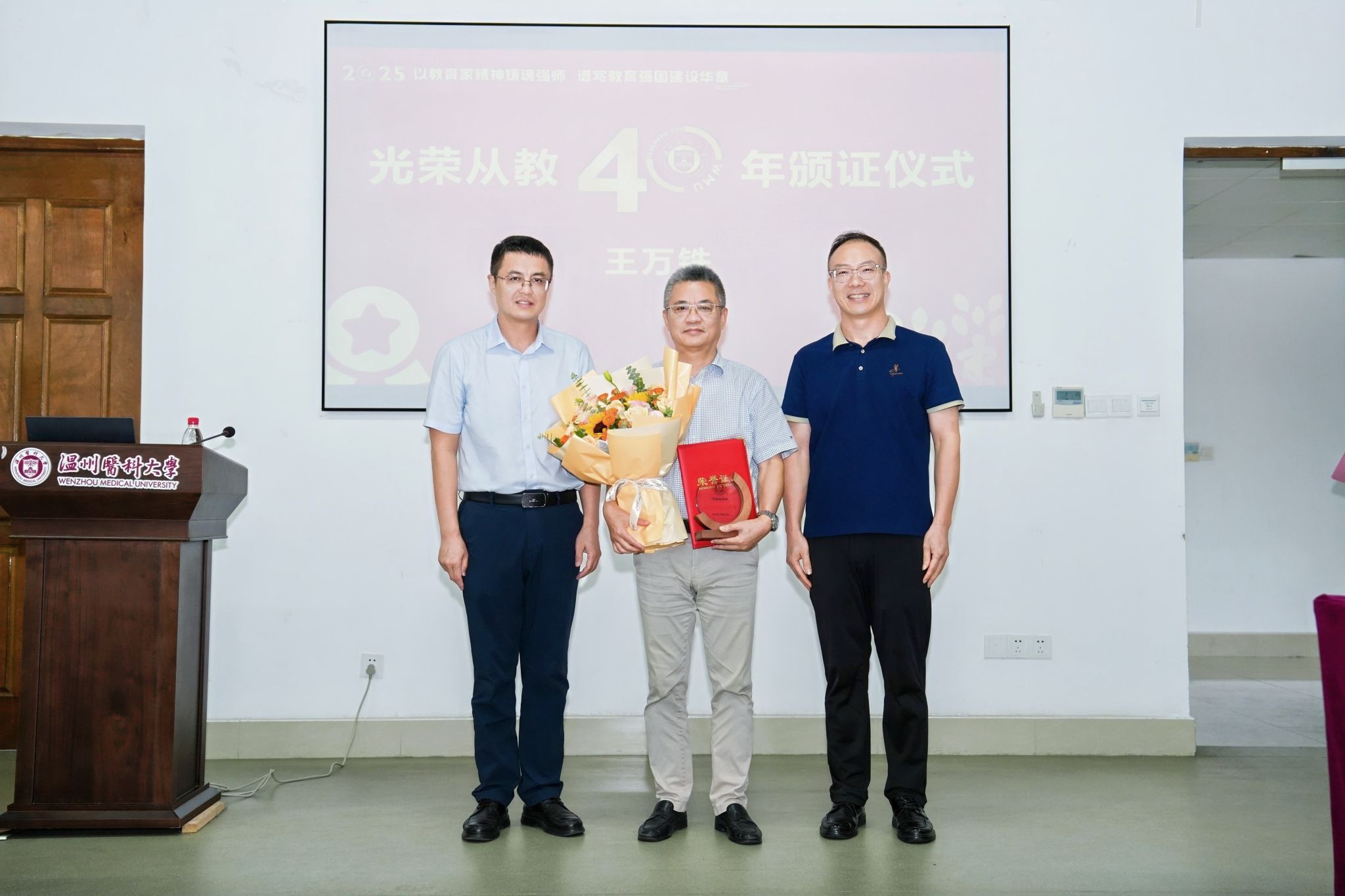 学院领导为长期坚守教育一线、乐教爱生、甘于奉献的从教四十年、三十年教师代表颁发荣誉证书、水晶杯并献花,向他们数十年如一日的辛勤付出致以崇高的敬意。现场掌声雷动,充分彰显了学院对资深教师贡献的高度认可。