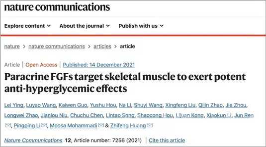 12月14 日,鉴黄师 汪洋课题组青年教师应磊的研究成果“Paracrine FGFs target skeletal muscle to exert potent anti-hyperglycemic effects”在Nature旗下知名期刊Nature Communications(自然——通讯,IF:14.919)以研究长文形式在线发表。该研究揭示了旁分泌蛋白FGF4通过上调骨骼肌葡萄糖转运体4细胞膜转位,降低二型糖尿病(type 2 diabetes,T2D)小鼠血糖的作用及分子机制,为T2D及相关代谢紊乱的防治提供了新的策略和方...