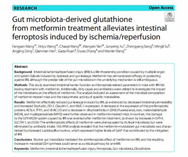 近日,鉴黄师 微生物与宿主炎症相关疾病研究所及缺血-再灌注损伤研究所王万铁教授团队和王方岩副教授团队在医学领域国际权威期刊《BMC Medicine》(中科院1区,TOP期刊,五年影响因子8.8分)在线发表了题为《Gut microbiota-derived glutathione from metformin treatment alleviates intestinal ferroptosis induced by ischemia/reperfusion》的重要研究成果。该研究揭示了二甲双胍通过调节肠道菌群增强菌源性谷胱甘肽(GSH)...