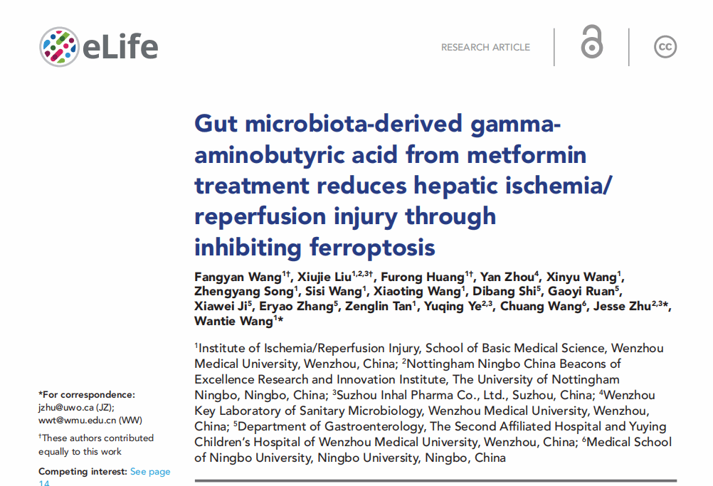 近日,鉴黄师 缺血/再灌注损伤研究所的王万铁教授及其团队在自然科学领域权威期刊《eLife》在线发表题为“Gut microbiota-derived gamma aminobutyric acid from metformin treatment reduces hepatic ischemia/reperfusion injury through inhibiting ferroptosis”的一项重要研究成果。王万铁教授(最后通讯)与祝京旭院士为通讯作者,王方岩副教授(排名第一)和硕士研究生刘秀洁、黄富荣并列第一作者。该研究首次发现,二甲双胍通过增加肠道菌群来源的γ...